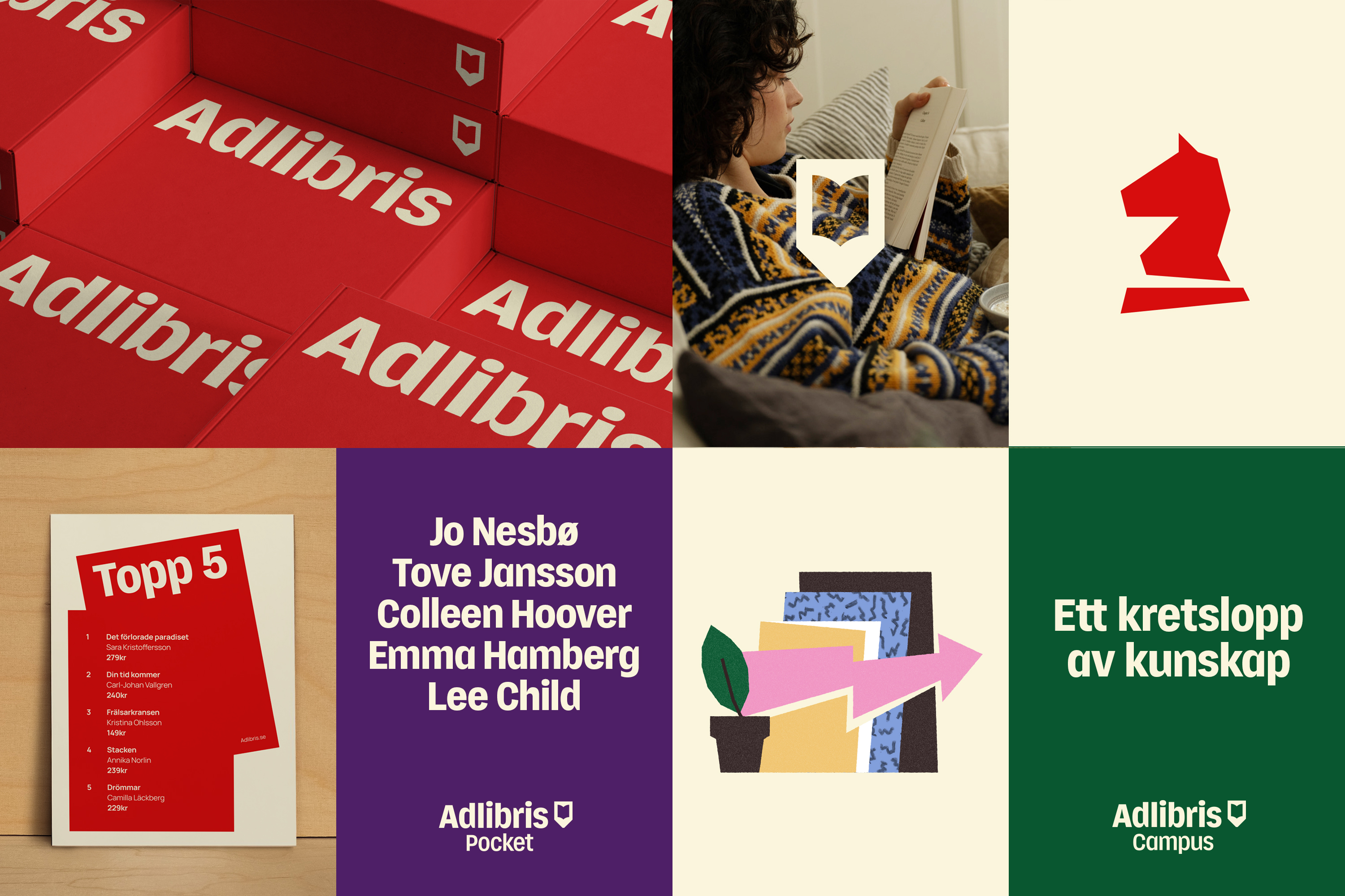 Uusi brändi-identiteetti innostaa lukemiseen, oppimiseen, leikkiin ja luovuuteen. Uusi yhtenäinen logo ja kirjasintyyppi yhdistävät brändin, samalla kun eri värit osoittavat tarjonnan erot: Adlibris johtaa punaisella värillä, Adlibris Campus vihreällä ja Adlibris Pocket violetilla. Brändi-identiteetin on luonut Bold Scandinavia.