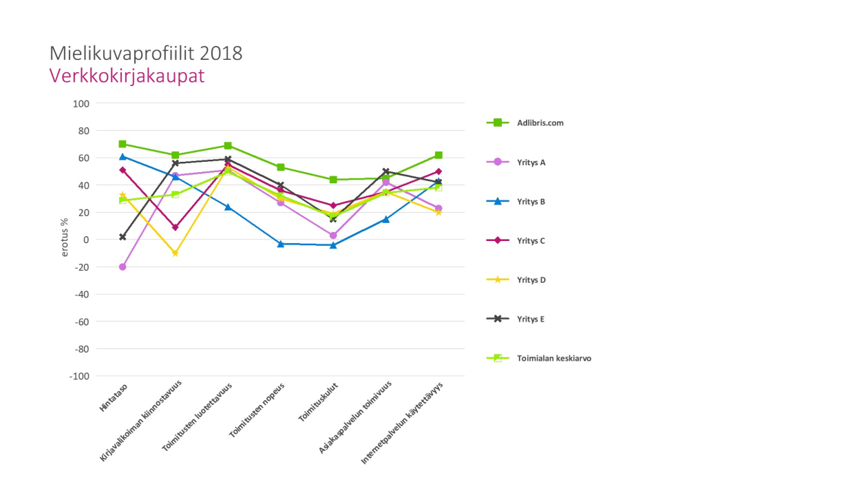Adlibris pitää tutkimuksen kärkisijaa myös seuraavissa mielikuvatekijöissä: hintataso, luotettava toimitus, kiinnostava valikoima, helppokäyttöinen internetpalvelu, nopea toimitus ja toimituskulut.