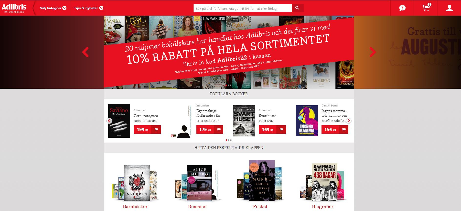 Adlibris är Nordens största bokhandel och erbjuder över 13 miljoner titlar med det senaste inom böcker, spel, pyssel, garn och allt som hör en modern bokhandel till. Adlibris Campus erbjuder studenter att köpa och sälja både ny och begagnad studentlitteratur och Adlibris Pocket erbjuder ett skräddarsytt och handplockat sortiment i reselägen. Adlibris är en del av Bonnier Group.